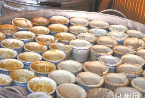 好吧,既然"蝦米碗糕"裡沒有蝦米,那麼,"田螺肉碗糕"裡總該有田螺肉了吧?很遺憾,也沒有。其實,田螺肉碗糕是在傳統碗糕的基礎上開發出來的新品種,《泉州習俗》有載,這種碗糕不同於泉州其他地方的雙發碗糕,氣孔細密,底部圓滑光亮,頗似琉璃燈泡,故亦稱"琉璃底碗糕"。吃起來既軟潤有彈性,又有鬆脆感,似有一種吃田螺的獨特口感。因此,這種型別的碗糕便被叫作"田螺肉碗糕"。