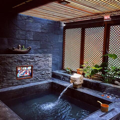 光聽名字就超有日式風味,整體建築是以日式原木為主,沿山勢而建,其中露天泉池是以石砌而成的庭園式空間,抬頭仰望就是天空,超有感,而會館裡還有日式流水的傳統造景,每天春櫻、秋楓時節,這裡便會全然變身為日本溫泉鄉,不用到京都就能體會濃濃的日式風情。